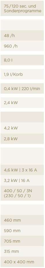 Theor. Leistung bis 48 Körbe/h, 960 Gläser/h
